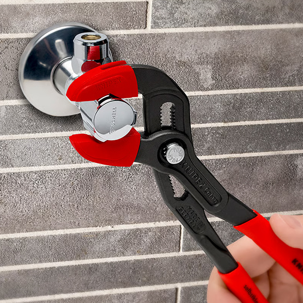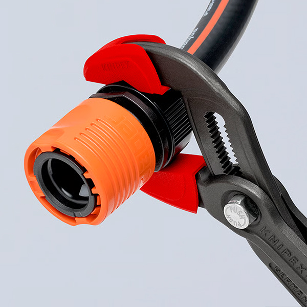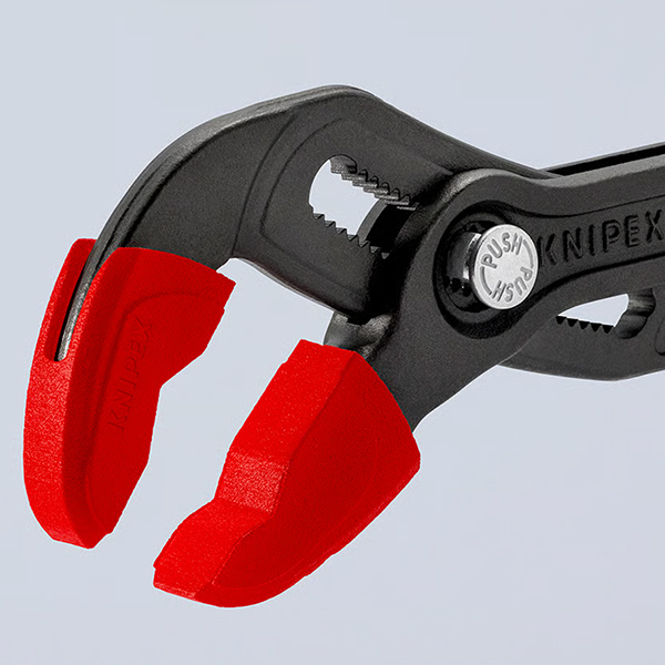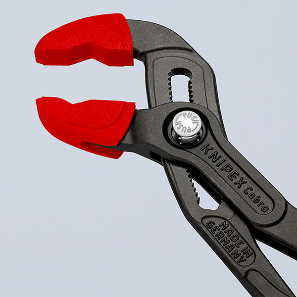 kìm mỏ quạ tác động trực tiếp lên phôi. Ngàm nhựa Knipex 87 09 250 V01 tạo thành vùng tiếp xúc mới giữa kìm và chi tiết. Bề mặt nhựa phẳng, trơn, không răng. Giảm ứng suất tập trung tại các điểm nhọn. Hạn chế biến dạng méo, hằn vết trên bề mặt ống hoặc ê-cu. Đặc biệt khi làm việc với chi tiết mạ crôm, mạ niken, phụ kiện inox, đồng thau hay các chi tiết có lớp sơn hoàn thiện.