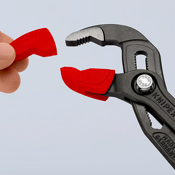 Chất liệu nhựa dùng cho Knipex 87 09 250 V01 được tối ưu cho nhiệm vụ làm lớp đệm trung gian: đủ cứng để truyền lực kẹp ổn định, đủ mềm để giảm tác động cơ học trực tiếp từ răng kìm lên bề mặt chi tiết.