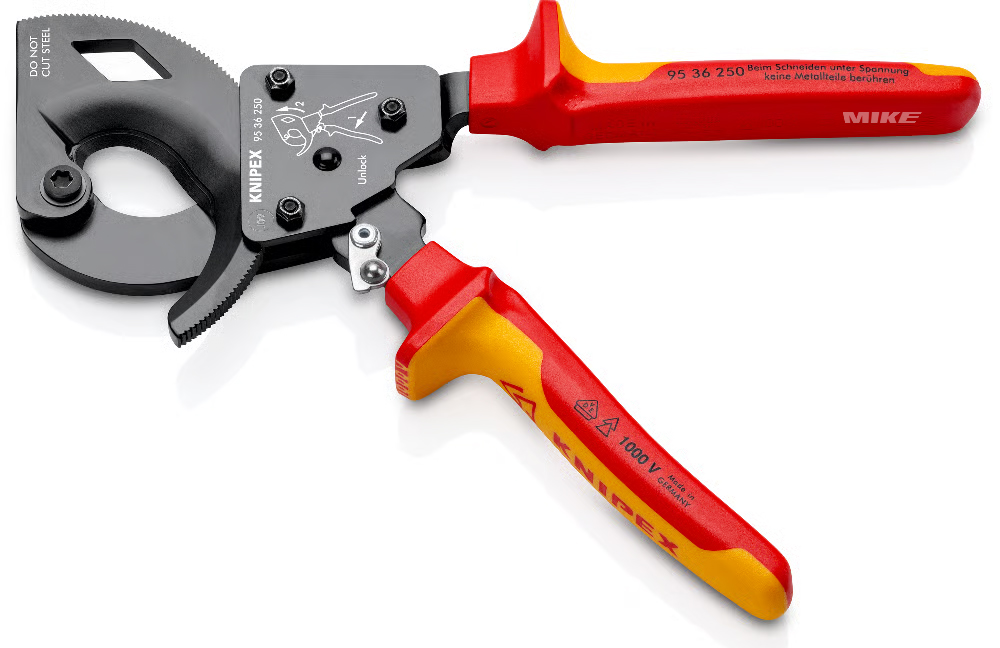 kéo cắt cáp Knipex 95 36 250 được ghi nhận đáp ứng tiêu chuẩn này. Nghĩa là phần tay cầm đã được thiết kế và kiểm tra để đảm bảo cách điện. Hoàn toàn phù hợp trong điều kiện làm việc thông thường của thợ điện.