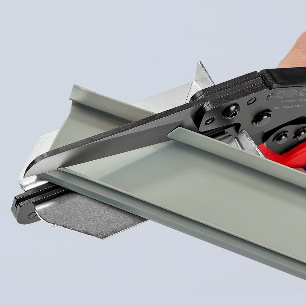 Kéo chuyên dụng Knipex 95 02 21 dùng để cắt và rút ngắn các loại nẹp nhựa, ống gen và máng cáp điện. Cơ cấu truyền lực đặc biệt kết hợp với lưỡi cắt hình học tối ưu tạo ra vết cắt gọn, ít biến dạng ngay cả với vật liệu nhựa cứng. Lưỡi kéo làm từ thép dụng cụ đặc biệt, tôi dầu tăng độ bền. Thân kéo chế tạo từ thép trắng. Chiều dài lưỡi 110 mm phù hợp cắt máng cáp bản rộng. Tay cầm phủ nhựa đa thành phần, tạo độ bám chắc và giảm lực tay khi thao tác. Kéo cắt nẹp nhựa này tập trung vào gia công vật liệu mềm như nhựa (~220 N/mm²). Không dùng cho dây kim loại có độ bền cao.
