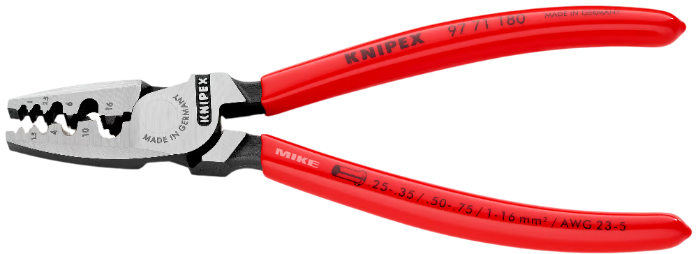 Kìm bấm cos Knipex 97 71 180 chuyên dùng ép các loại cos ống theo chuẩn DIN 46228 phần 1 và 4. Thiết kế gọn nhẹ (205 g), dài 180 mm. Đầu kìm mài bóng, tay cầm bọc nhựa PVC đơn giản, dễ thao tác. Kết cấu truyền lực tối ưu, giảm lực tay khi ép, đảm bảo mỗi lần bấm chắc chắn, chính xác. Kìm có 9 vị trí ép dạng nửa tròn sâu, mặt bên thuôn hình nón, giữ đầu cos ổn định trong suốt quá trình bấm.