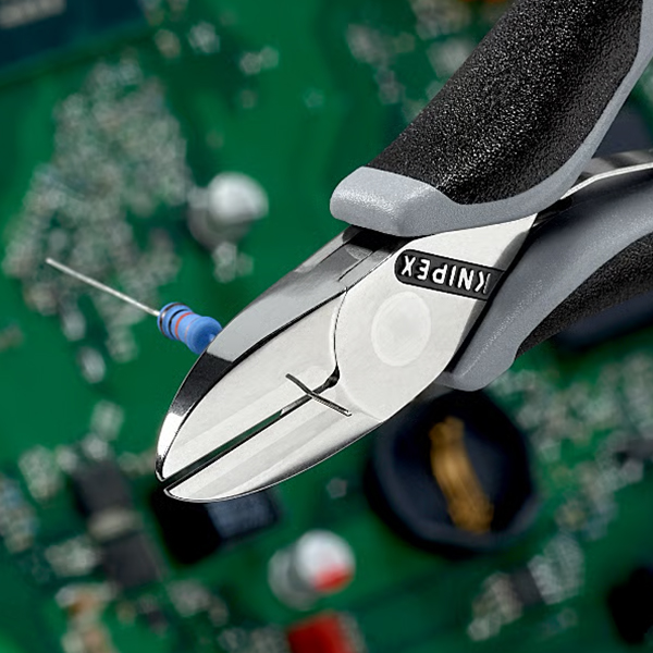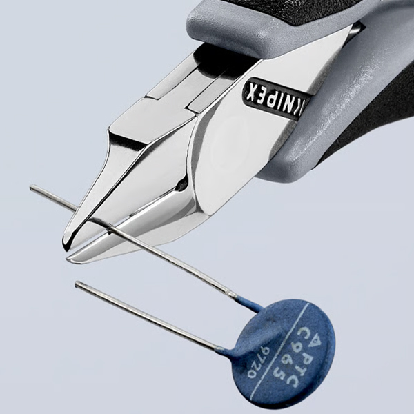 Tay cầm công thái học. Thiếu kế multi-component grips hai màu (đen/xám). Cổ cao, ôm trọn lòng bàn tay, có điểm tì ngón tay cái và ngón trỏ. Tạo cảm giác thoải mái, chống trượt. Giúp người dùng điều khiển chuẩn xác trong thao tác. Nhờ tỷ số truyền lực cao, kìm ESD Knipex giúp giảm đáng kể lực tay cần thiết. Đặc biệt hữu ích trong các công đoạn lặp lại hoặc khi cắt nhiều chân linh kiện nhỏ.