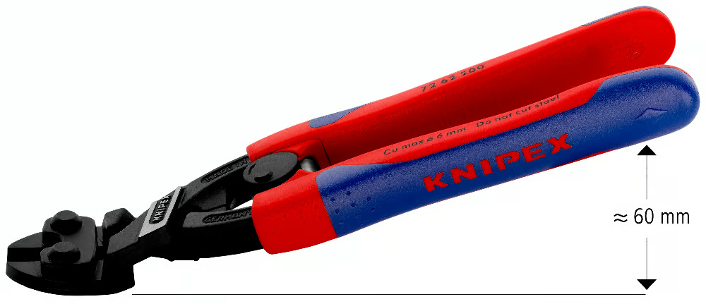 Knipex 72 62 200 có lưỡi cắt tinh, chuyên cho vật liệu mềm như kim loại màu (độ bền kéo ~220 N/mm²) hoặc nhựa tổng hợp. Toàn bộ phần