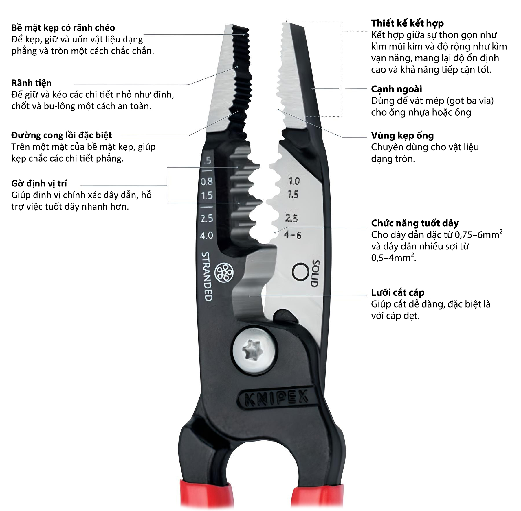 - Chức năng: Cắt, tuốt vỏ dây, kẹp và uốn dây dẫn