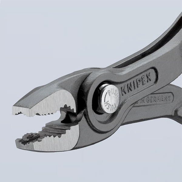 Kìm tháo ốc mòn TwinGrip Knipex 82 02 150 sử dụng chuyên biệt cho các tình huống bu-lông, đai ốc, vít bị toe đầu, mòn đầu hoặc gỉ sét. Khiến tô vít, khẩu, cờ-lê thông thường không bám mở được. Cấu trúc ngàm kẹp phía trước kết hợp ngàm kẹp bên hông giúp xử lý ốc mòn ở nhiều vị trí khác nhau. Từ mặt chính diện đến cạnh. Phù hợp cho công việc bảo trì, sửa chữa, lắp đặt trong xưởng cơ khí, gara ô tô, công trình lắp đặt ống và hệ thống thiết bị kỹ thuật. Điểm nổi bật của Knipex TwinGrip 82 02 150 nằm ở phần ngàm trước “cắn” sâu. Răng kẹp khỏe cùng tỉ số truyền lực tập trung ngay tại đầu ngàm. Cấu trúc răng đối xứng. Bề mặt kẹp kết cấu răng cưa, bám chặt đầu ốc bị tròn cạnh, bị bavia hoặc mòn rãnh. Giúp người dùng xoay, nới lỏng hoặc siết chặt lại bu-lông, đai ốc một cách kiểm soát.