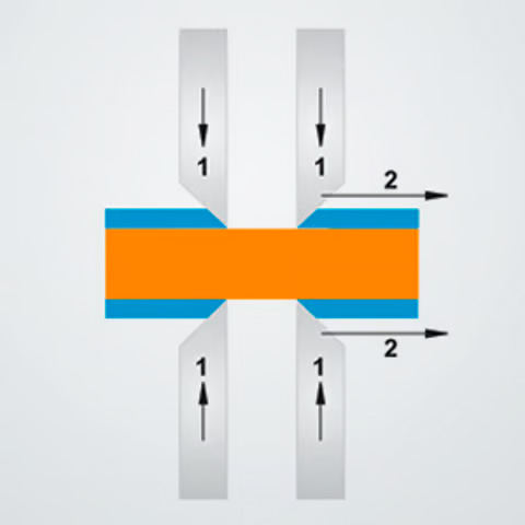 Một cặp lưỡi dao (ở hình bên trái) giữ chặt phần vỏ cách điện còn lại, trong khi cặp còn lại kéo tách phần cần tuốt. |