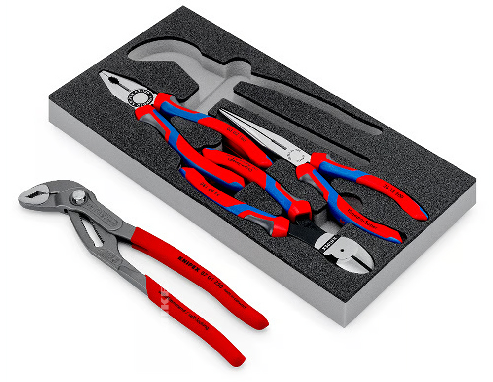 Bộ 4 kìm KNIPEX 00 20 01 V15 bao gồm kìm cắt cạnh, kìm đa năng đầu bằng, mũi nhọn, kìm mỏ quạ. Bộ được thiết kế tối ưu không gian làm việc. Sử dụng tích hợp với bàn nguội, tủ đồ nghề và xe đẩy dụng cụ. Kích thước khay 335 x 165 x 33 mm phù hợp nhiều ngăn kéo tiêu chuẩn trong xưởng cơ khí và khu bảo trì. Khay xốp hai màu phân biệt trực quan từng vị trí đặt kìm. Các hốc định hình được gia công đúng kích thước từng cây kìm. Giữ ổn định khi di chuyển, hạn chế va đập làm hư hỏng kìm.