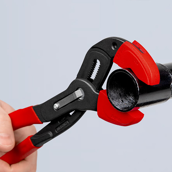 kìm mỏ quạ tác động trực tiếp lên phôi. Ngàm nhựa Knipex 87 09 250 V01 tạo thành vùng tiếp xúc mới giữa kìm và chi tiết. Bề mặt nhựa phẳng, trơn, không răng. Giảm ứng suất tập trung tại các điểm nhọn. Hạn chế biến dạng méo, hằn vết trên bề mặt ống hoặc ê-cu. Đặc biệt khi làm việc với chi tiết mạ crôm, mạ niken, phụ kiện inox, đồng thau hay các chi tiết có lớp sơn hoàn thiện.