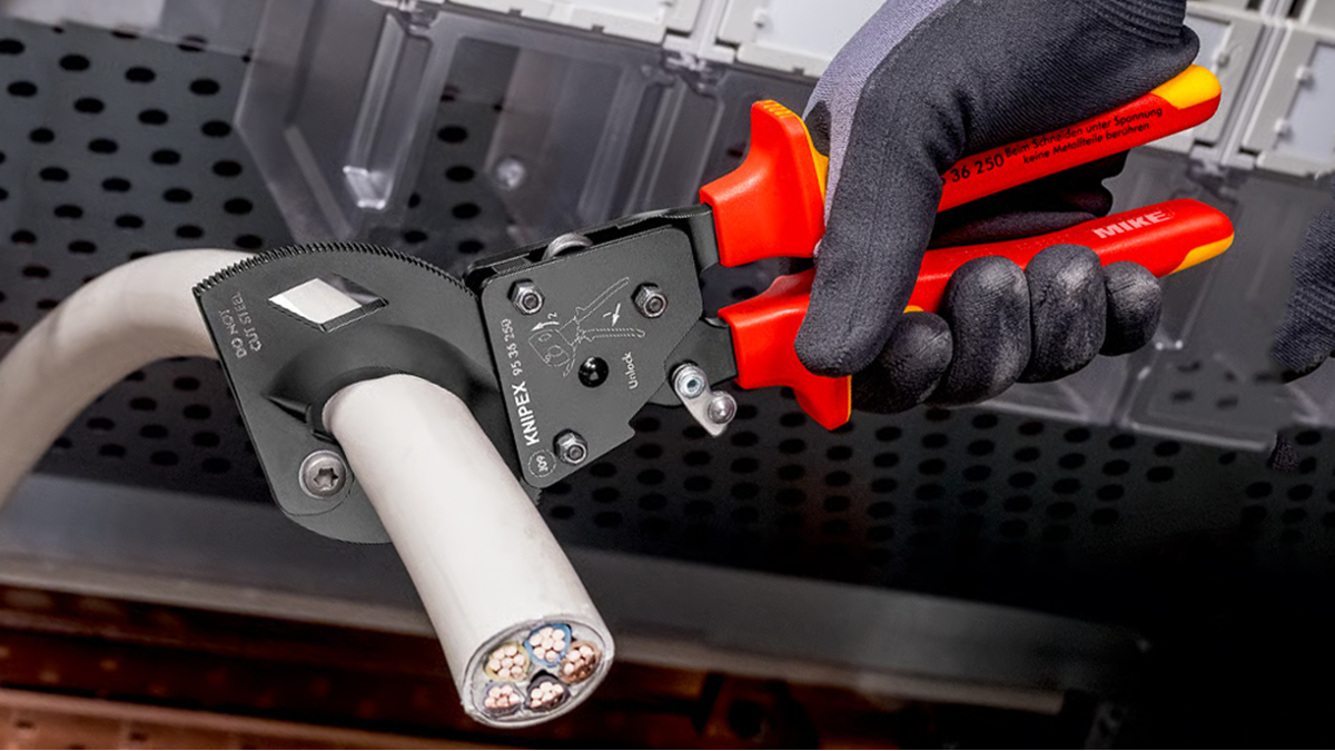 Kéo cắt cáp Knipex 95 36 250 sử dụng cơ cấu ăn khớp nhông hai giai đoạn. Phù hợp cắt dây đồng và nhôm có tiết diện đến 240 mm² (tương đương Ø 32 mm). Cơ cấu bánh cóc cho phép vận hành bằng một tay với lực bóp nhẹ. Cắt gọn mà không làm dập hay biến dạng sợi cáp. Made in Germany, nhập khẩu chính hãng.