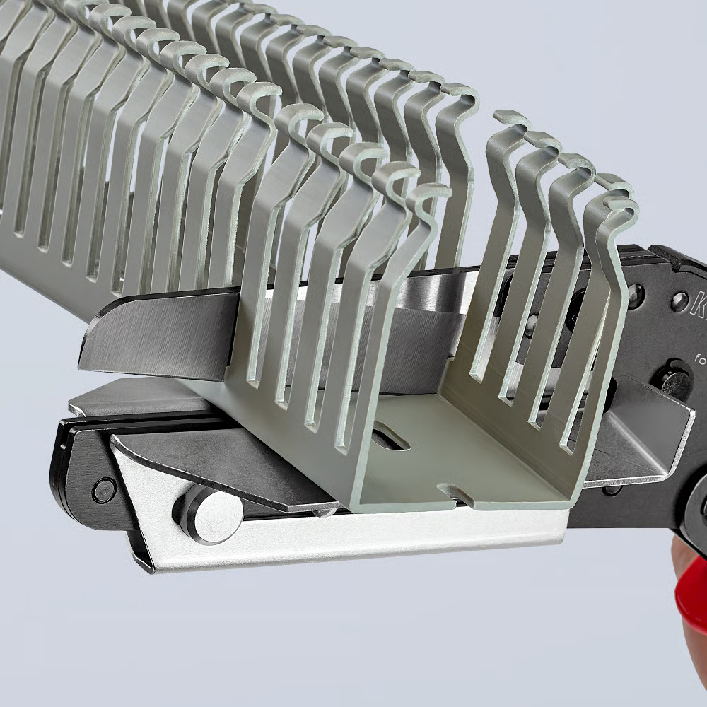Kéo chuyên dụng Knipex 95 02 21 dùng để cắt và rút ngắn các loại nẹp nhựa, ống gen và máng cáp điện. Cơ cấu truyền lực đặc biệt kết hợp với lưỡi cắt hình học tối ưu tạo ra vết cắt gọn, ít biến dạng ngay cả với vật liệu nhựa cứng. Lưỡi kéo làm từ thép dụng cụ đặc biệt, tôi dầu tăng độ bền. Thân kéo chế tạo từ thép trắng. Chiều dài lưỡi 110 mm phù hợp cắt máng cáp bản rộng. Tay cầm phủ nhựa đa thành phần, tạo độ bám chắc và giảm lực tay khi thao tác. Kéo cắt nẹp nhựa này tập trung vào gia công vật liệu mềm như nhựa (~220 N/mm²). Không dùng cho dây kim loại có độ bền cao.