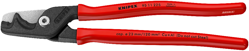 Kìm cắt cáp Knipex 95 11 225 StepCut XL, phiên bản kích thước lớn của dòng StepCut. Dài 225 mm, model này phù hợp cho cả thao tác một tay hoặc hai tay. Thiết kế chuyên để cắt các loại cáp mềm nhiều lõi có tiết diện lớn, ứng dụng rộng rãi trong nhà máy công nghiệp, kết nối điện dân dụng hoặc dây tiếp địa cỡ lớn.