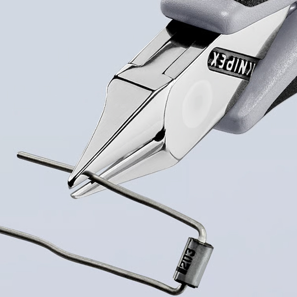 Tay cầm công thái học. Thiếu kế multi-component grips hai màu (đen/xám). Cổ cao, ôm trọn lòng bàn tay, có điểm tì ngón tay cái và ngón trỏ. Tạo cảm giác thoải mái, chống trượt. Giúp người dùng điều khiển chuẩn xác trong thao tác. Nhờ tỷ số truyền lực cao, kìm ESD Knipex giúp giảm đáng kể lực tay cần thiết. Đặc biệt hữu ích trong các công đoạn lặp lại hoặc khi cắt nhiều chân linh kiện nhỏ.