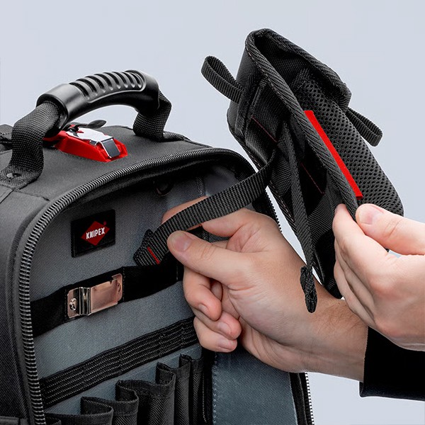 Mặt sau có hai dây đai vải chắc chắn để gắn trực tiếp vào hệ thống dây MOLLE của balo Knipex Modular X18. Ngoài ra, túi cũng có thể dùng như túi đeo thắt lưng linh hoạt trong công việc. Kích thước 190 × 135 × 40 mm, khối lượng 116 g, gọn nhẹ nhưng đủ để chứa nhóm phụ kiện quan trọng cho từng dự án.